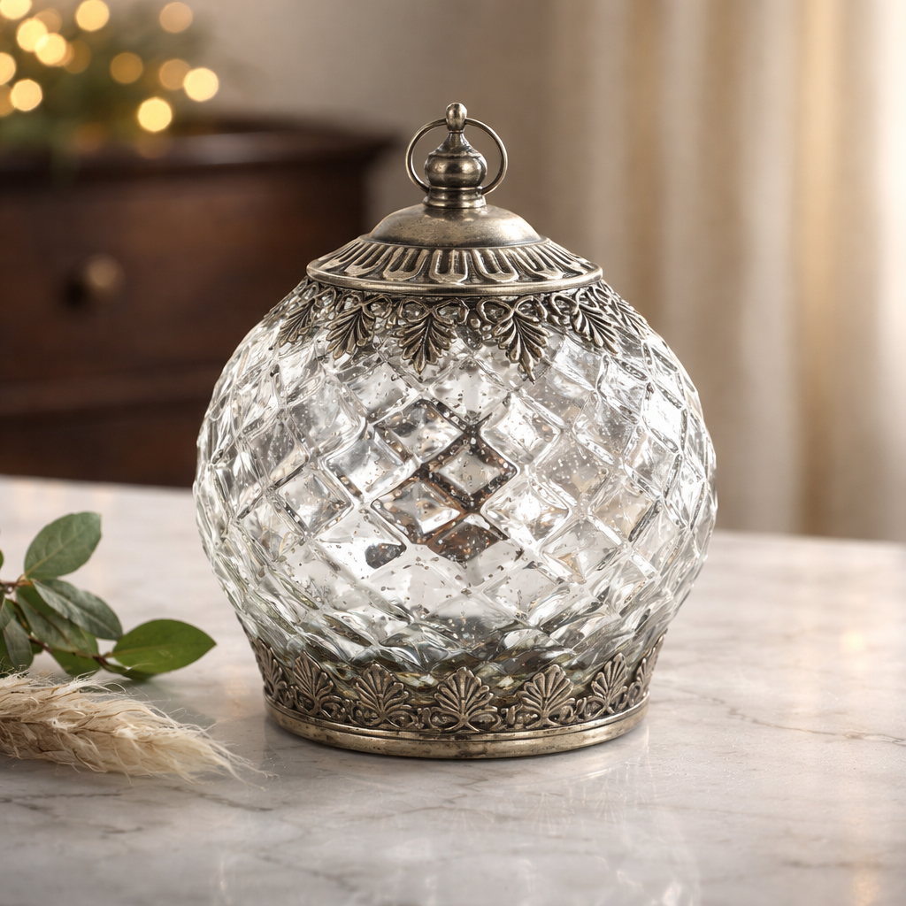 A smaller diamond effect silver Moroccan lantern. Filled with warm white LED lights, which shine through beautifully.